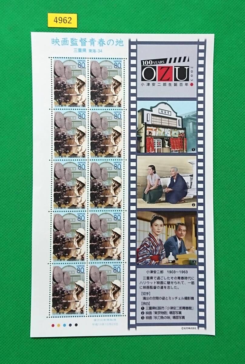 > ふるさと切手/三重県/映画監督青春の地/小津安二郎生誕百年/東海-34/切手シート/2003年10月23日/極上美品/糊艶良好/No.4962