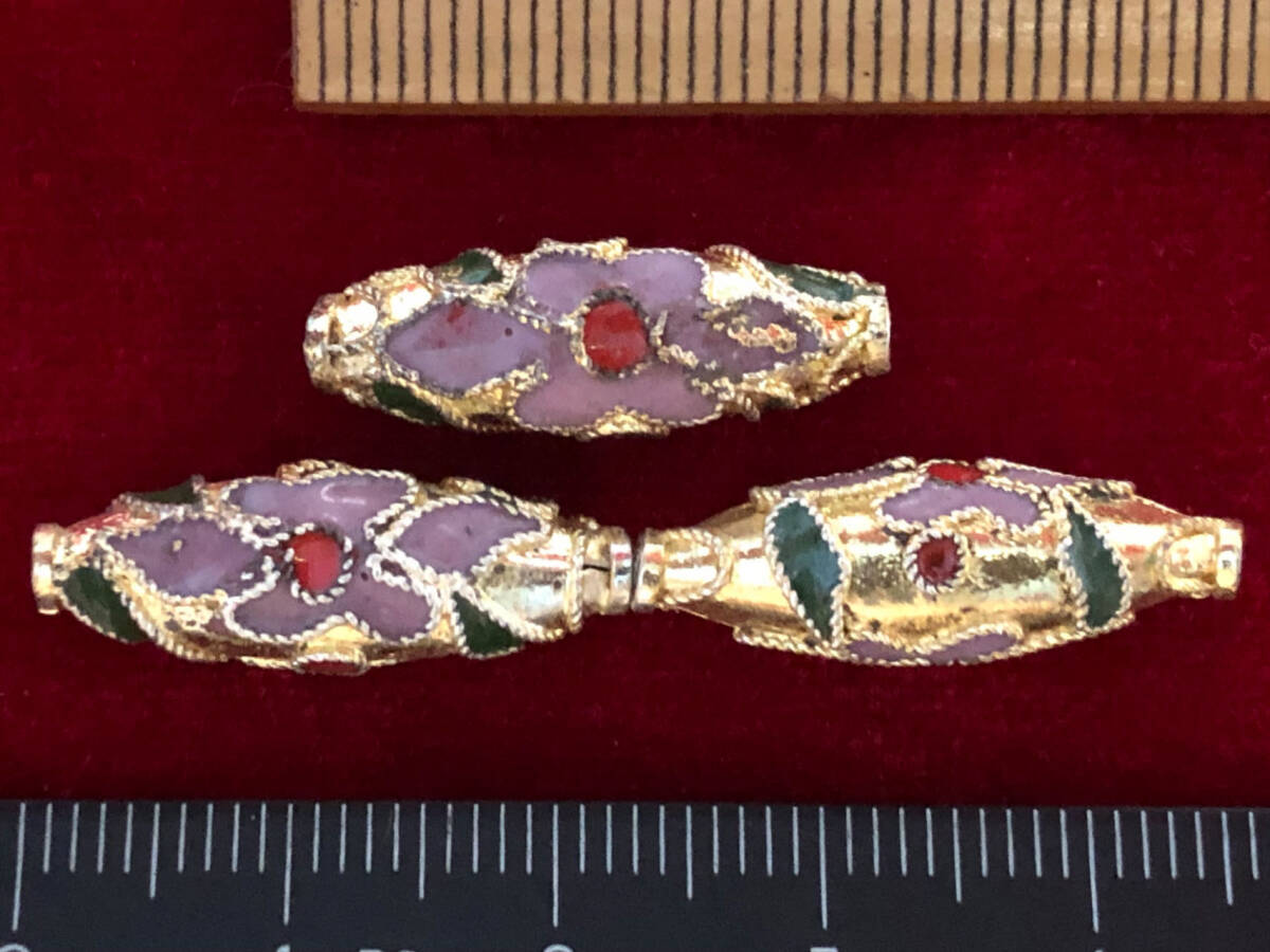 - ¶!¶ 有線七宝焼ワールド - 3個細長楕円大玉で1単位 ¶!¶ 約Φ7㎜×長22㎜細長楕円 金線に金色釉紫色花 手作 手芸 工芸 インテリア 趣味