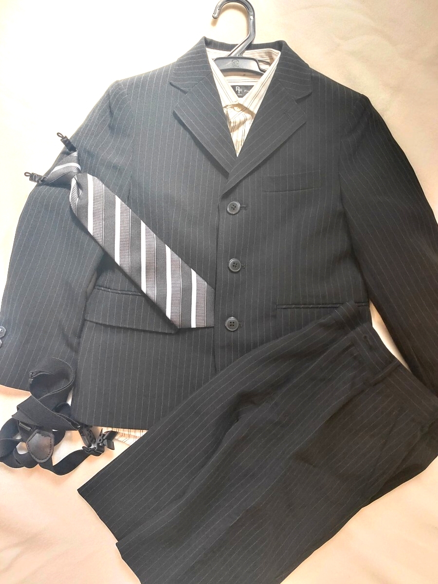 - 子供用120センチ スーツ セットアップ ストライプ柄 ブラック ダブル パンツ ジャケット 入学式 卒業式 式典 結婚式 発表会