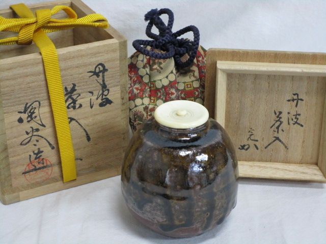 - 雉坂★【 丹波焼 文茄茶入 森本陶谷 共箱 書付-堀内兼中斎(堀内宗完)】茶道具・唐物茶入・文琳茶入・茄子茶入