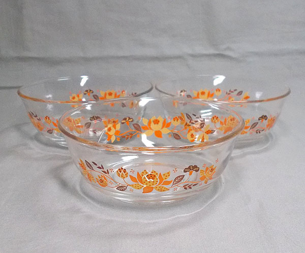 - ガラスボウル3個セット 花柄 昭和レトロ ガラス小鉢 ヨーグルト フルーツ缶 未使用 長期保管品