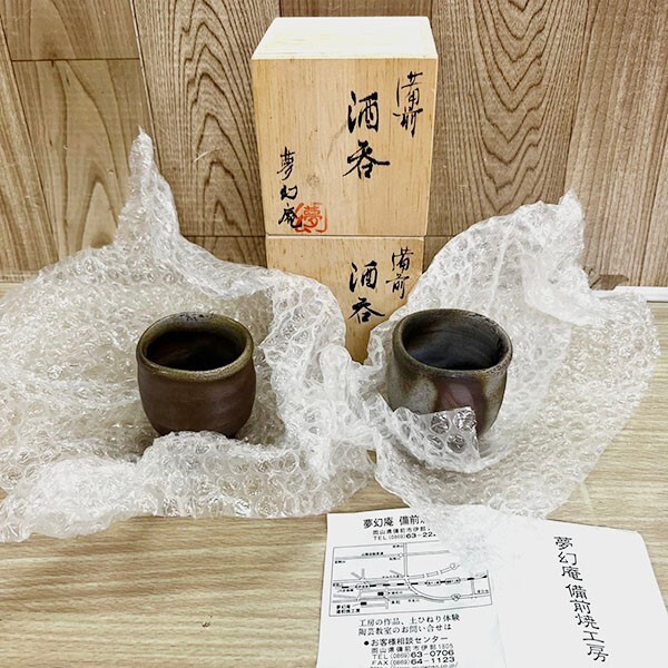 > 送料無料◆備前焼 酒器 夢幻庵 備前焼工房 2個セット 陶芸品 アンティーク 箱入り 中古品(美品) 札幌市発