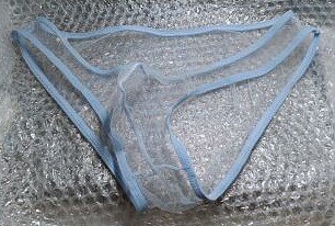 - ノーブランド品、メンズ、ビキニ、オール薄水色メッシュ、フロント部立体的フルシーム、素材不明、M~Lサイズ、