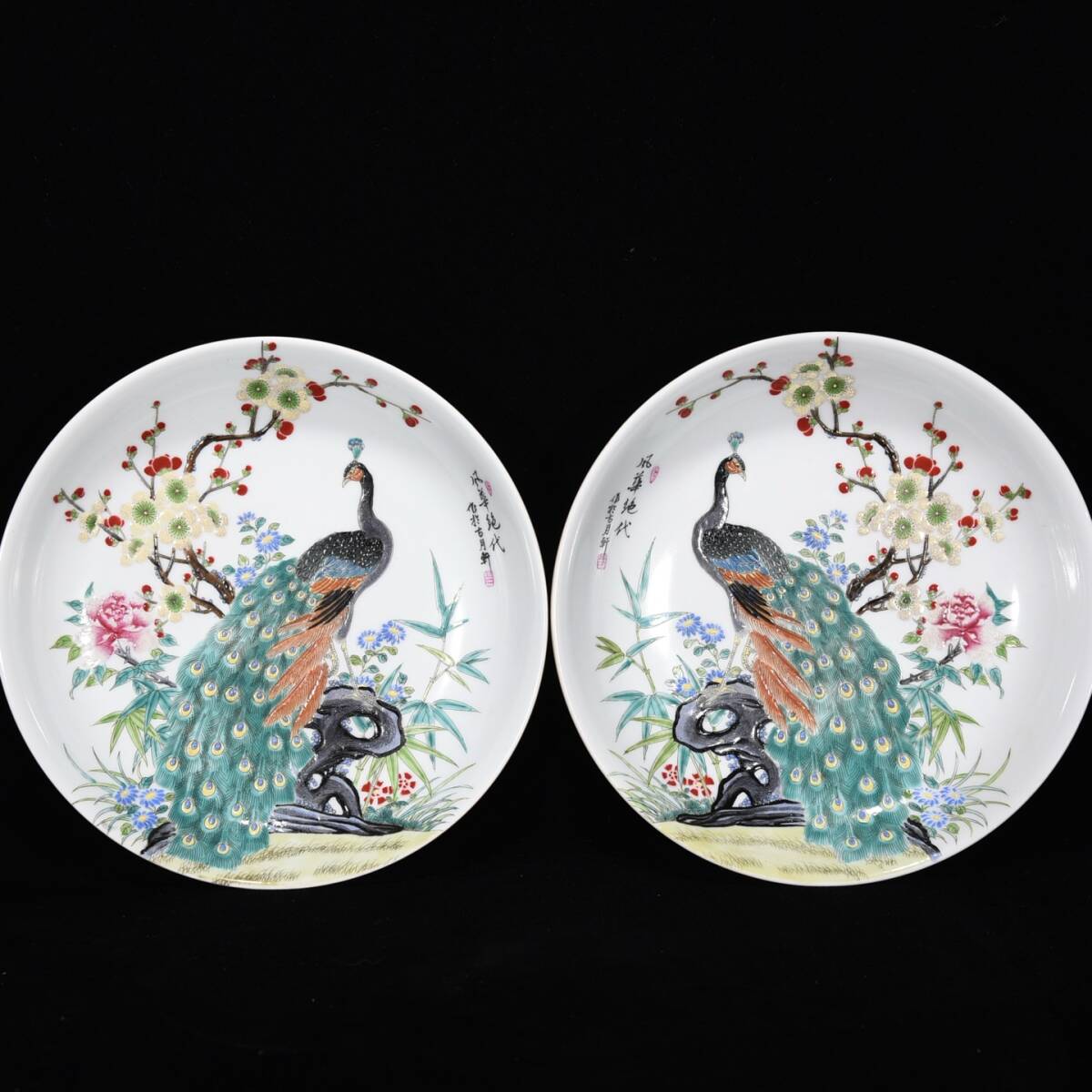 - ◆珍蔵◆中国古美術 大清雍正年製款 粉彩 古陶磁 鳳凰花卉紋盤―對 精品 細密細工造 置物 擺件 古賞物 骨董 時代物 A06