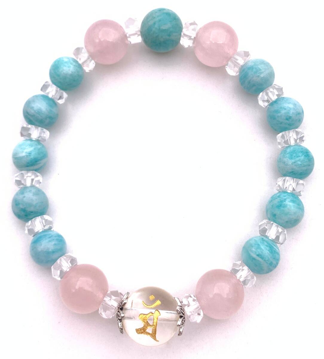 - 天然石水晶守護仏梵字金彫り12mm玉&ローズクォーツ&アマゾナイト のブレスレット