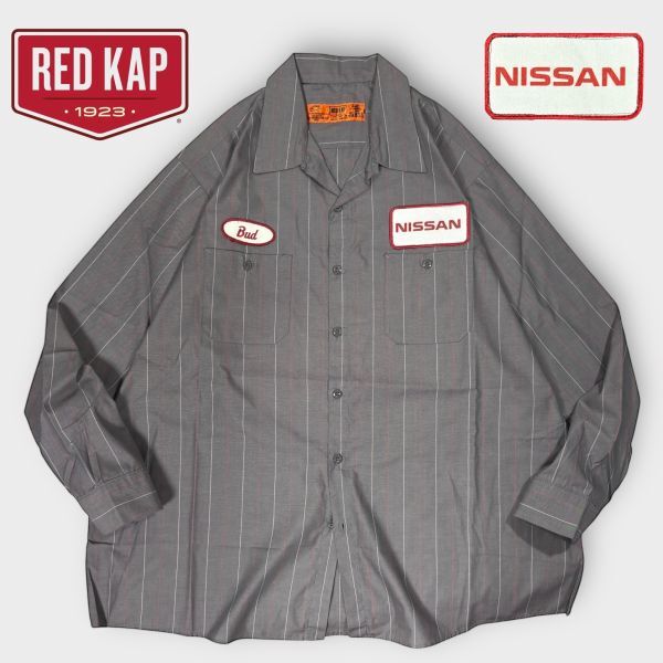 > ★NISSANロゴワッペン★BIGサイズ★ストライプ柄★RED KAP長袖ワークシャツ sizeXXL レッドキャップ 古着 クリーニング プレス済み 2499