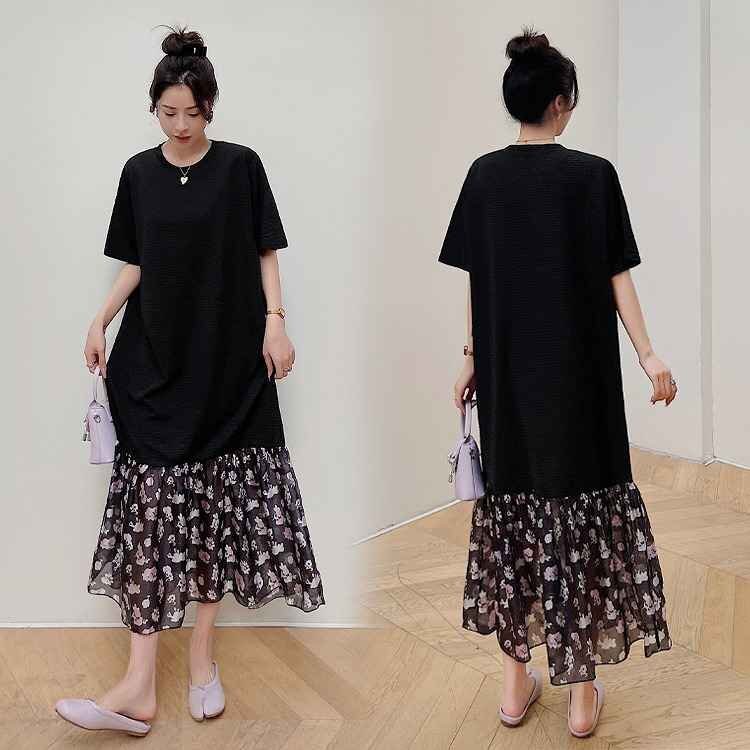 - 半袖ワンピース フリル 切り替え バイカラー 体型カバー 着痩せ 【大きいサイズあり】 XL ブラック