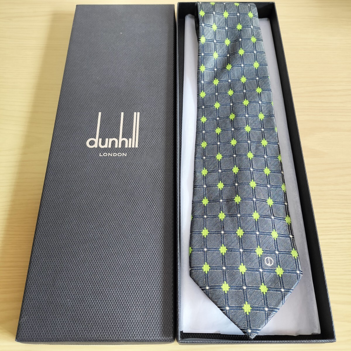 - ダンヒル(Dunhill)紺色緑結晶格子柄Dロゴ模様ネクタイ