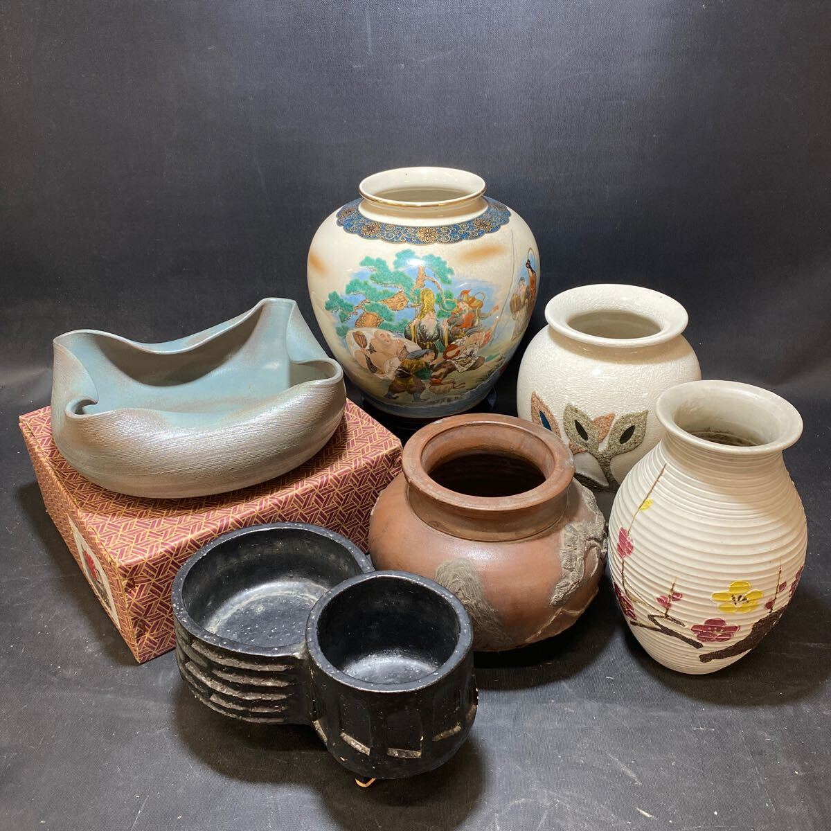 > N 5912 [ 花器 6点 まとめて ] 九谷焼 七福神 フラワーベース 漆器 陶器製 高台 水盤 壺 花生け 花入れ 花活け 茶道具 花瓶 現状品