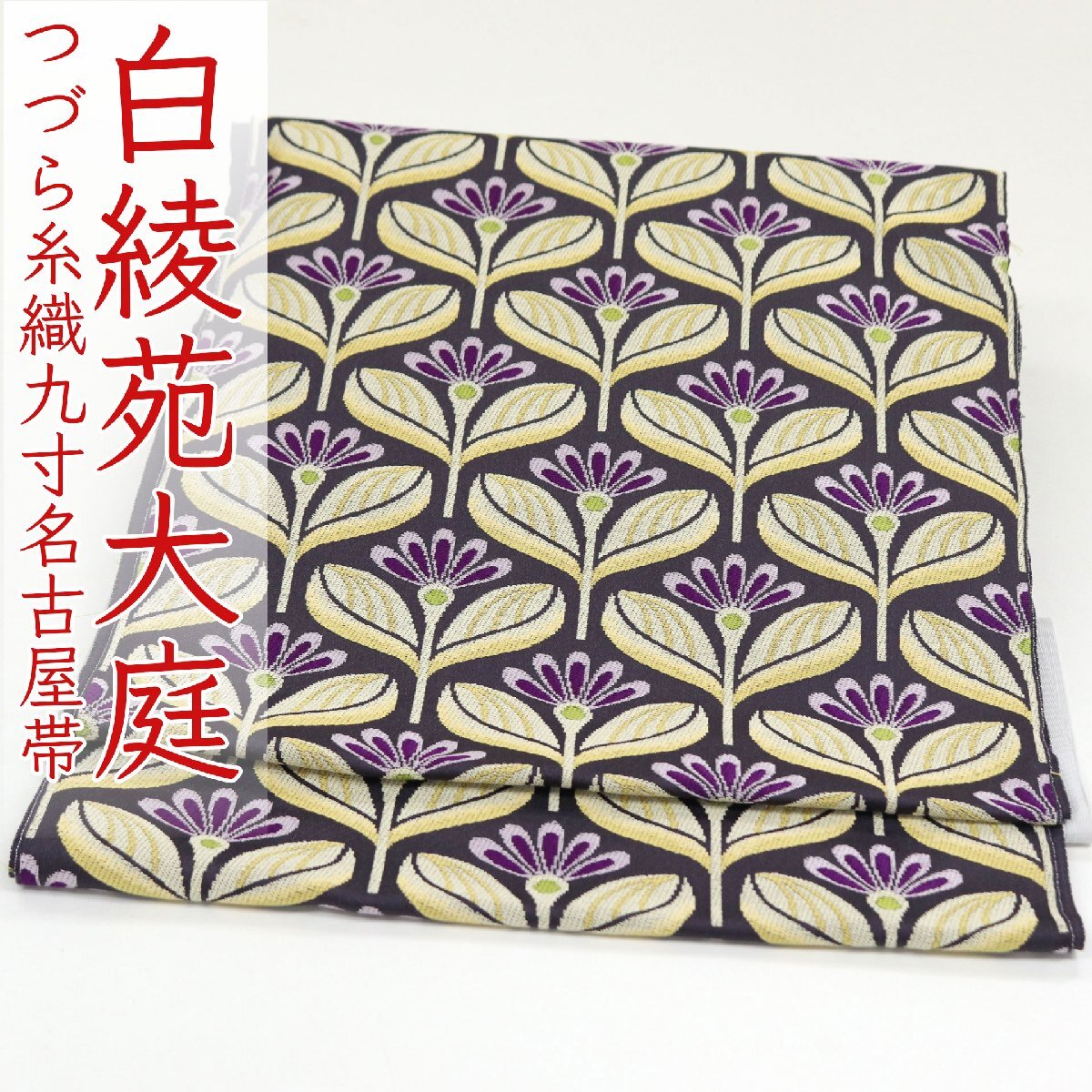 > 和遊館 即決ona4512 西陣 白綾苑大庭 つづら糸織 九寸 名古屋帯 花割付 紫紺色 お仕立て付き