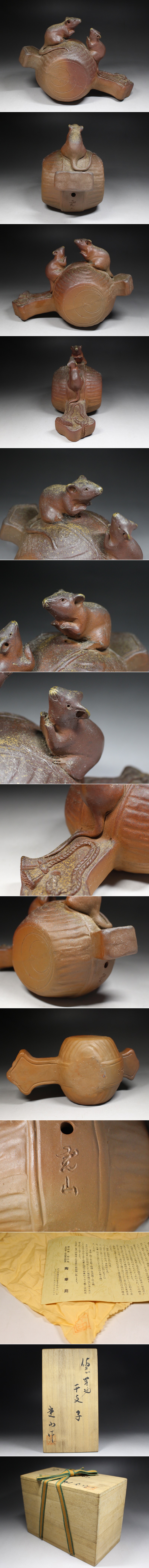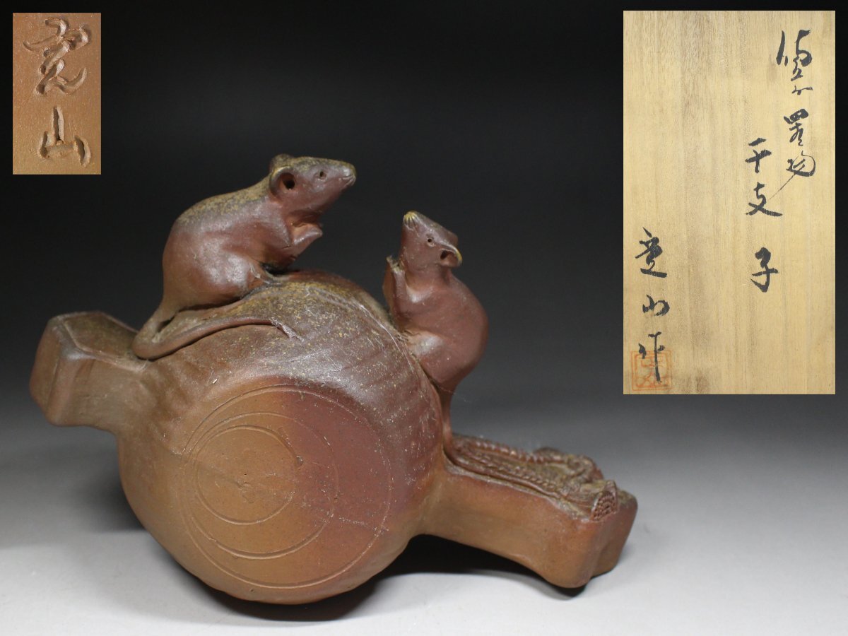 - ◆備前・陶華苑・子・置物・干支・鼠・打ち出の小槌・床置・厄除・縁起物・商売盛・在印・在銘・栞・共箱◆a9114h