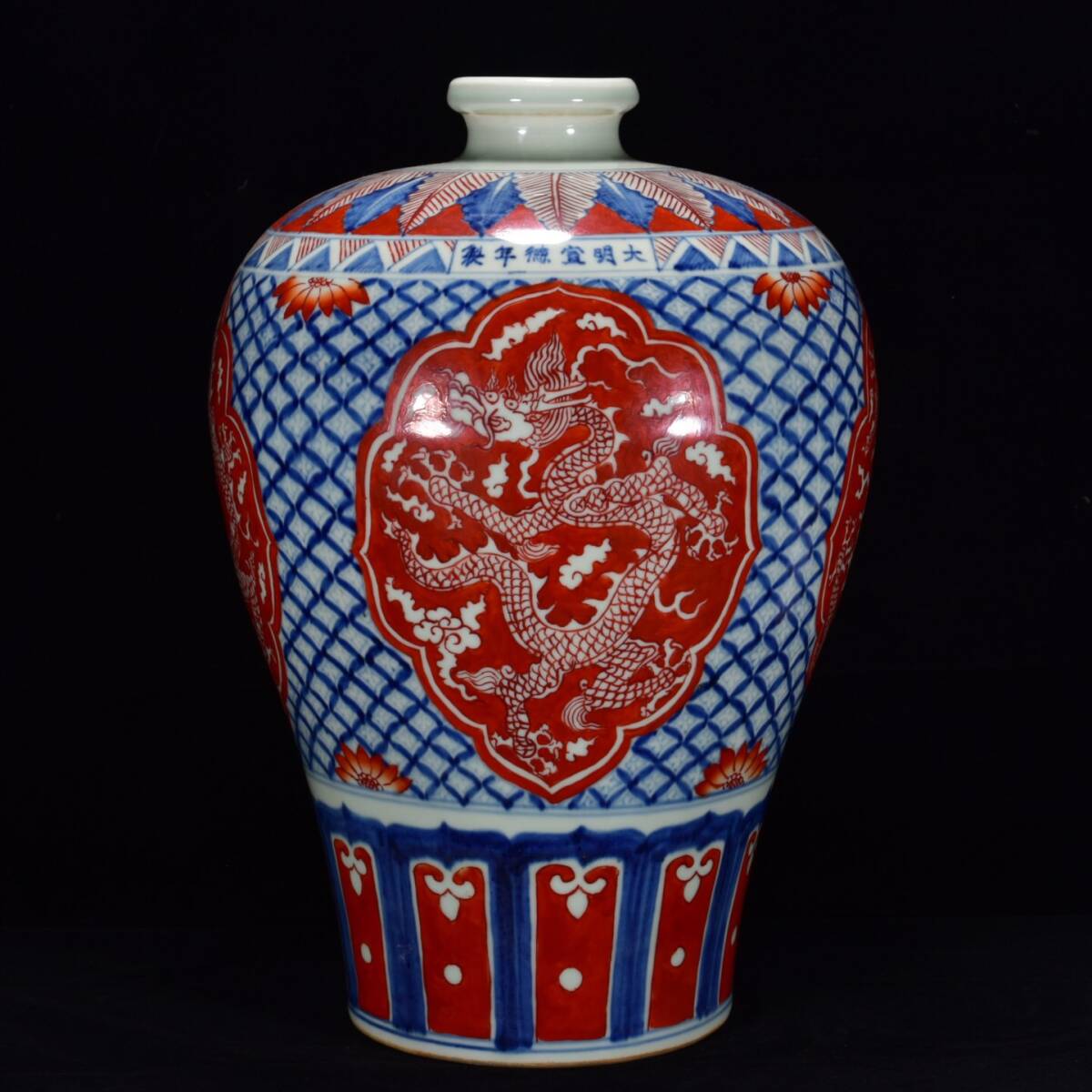 - 【超珍館蔵】明 宣德年製款 古陶瓷品 青花 加彩 龍紋 梅瓶 陶藝 古賞物 古董品 古美術品 時代物 旧家蔵出 稀少珍蔵品