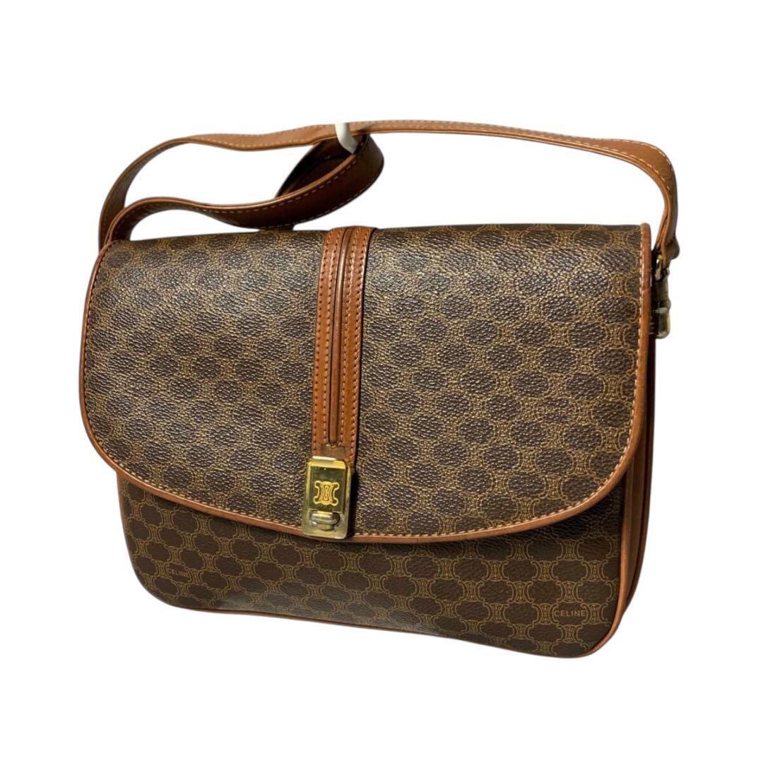 - 【美品】CELINE セリーヌ PVC レザー ショルダーバッグ 斜めがけ カバン クロスボディ ゴールド金具 マカダム トリオンフ ブラウン系