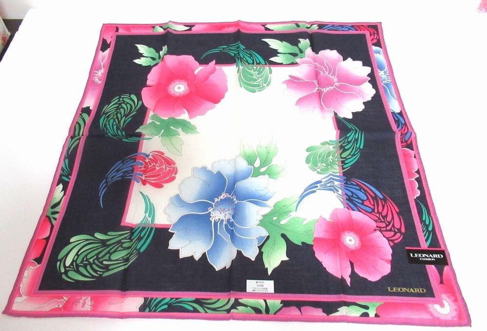 > ♪未使用/紙ケース付き!LEONARD(レオナール)ハンカチ/大判/ハンカチーフ/コットン100%/お花柄/日本製/サイズ約51.5㎝×約51.5㎝