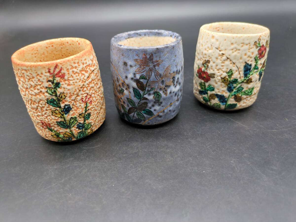 - 茶道具 九谷焼 湯呑3個セット 絵がわり 九谷秋峰 在銘◇丸盆 湯呑 茶托 掘り出し物 店三168