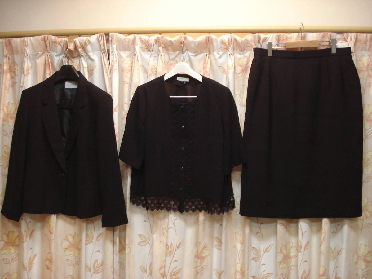 > 送料無料!美品!秋・冬物!19ABRサイズ上下セット!高級ブラックフォーマル3ピースシングルスーツ!ウェスト93cm!黒色!ロングスカート
