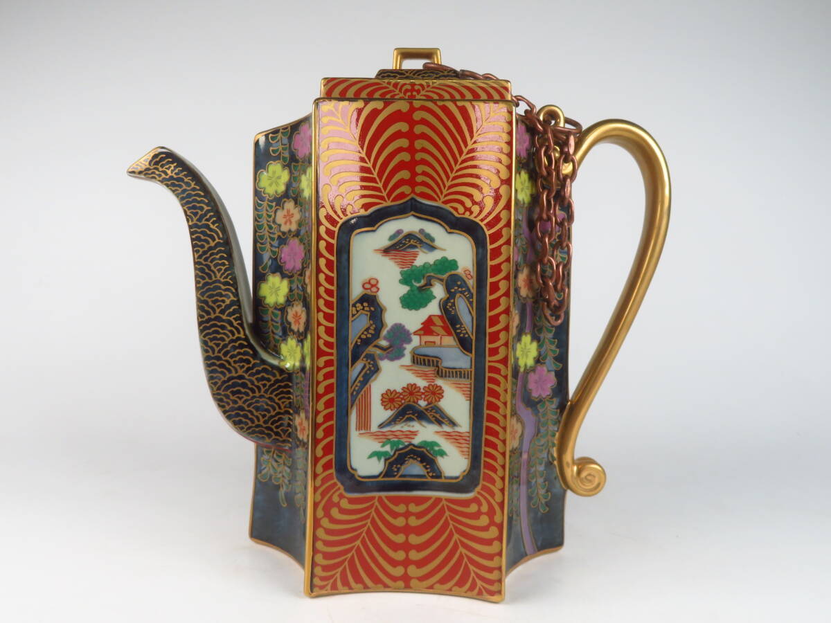 - 有田焼の人気陶芸作家 林九郎 極上染錦山水花紋六角 水注 急須 茶道具 作家 在銘 細密絵付 骨董品 古美術品 高さ19cm【913】