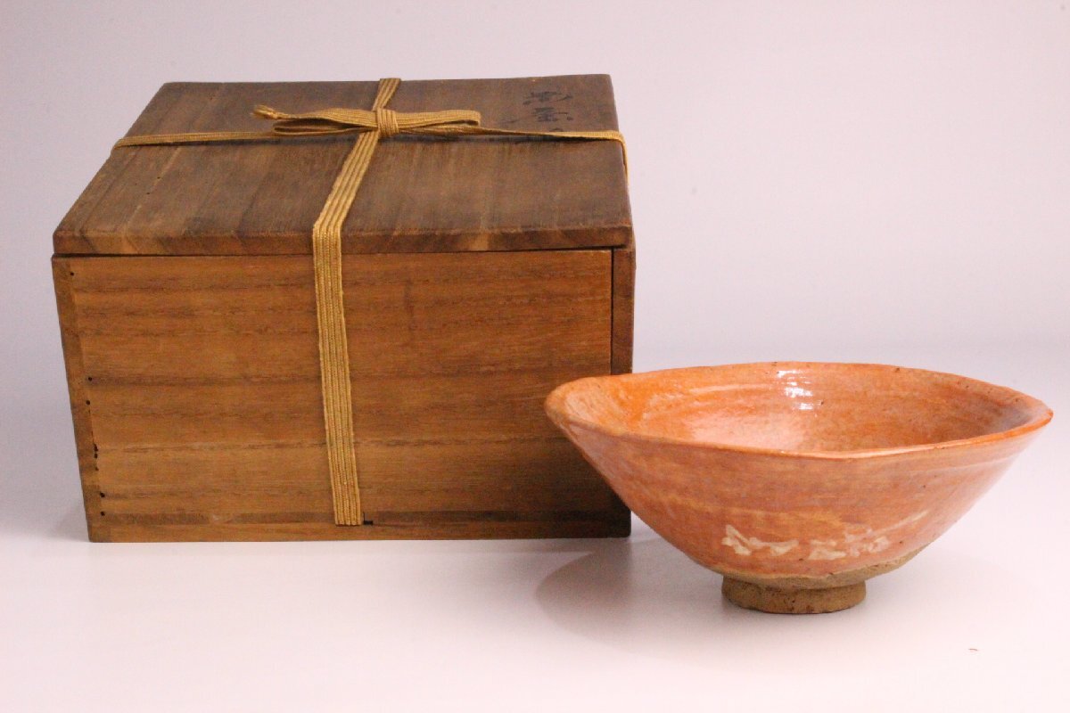- 「狸庵RS」 瀬戸 豊楽焼 6代 豊助 作 五徳庵 書付 銘: 名残 赤茶碗「 極箱」/ なごり茶事 平茶碗 パリ万博 ☆本物保障☆
