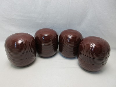 - M607714 【 ほぼ未使用 茶道具 木製溜塗 信玄三段弁当 千筋 4客揃 内朱 紙箱 】 検) 懐石道具 煎茶道具 重箱 会席 茶会 お花見 蓋物 ⅲ