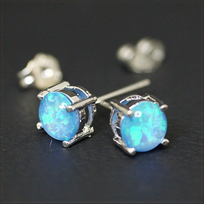 - [EARRING] Silver Plated Blue Fire Opal ハイクオリティ φ6mm ラウンド ブルーファイア オパール シルバー スタッド ピアス 【送料無料】