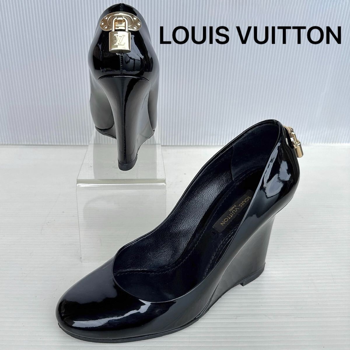 - LOUIS VUITTON LV ルイヴィトン パドロックヒール ウェッジソール 南京錠 サンダル パンプス レーディス シューズ 靴 黒 エナメルレザー 35