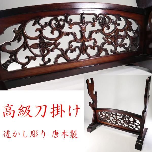 【 恵 #1843 】 高級刀掛け 花唐草透かし彫り ズシリと重い上質唐木 高級拵えに相応しい一品です