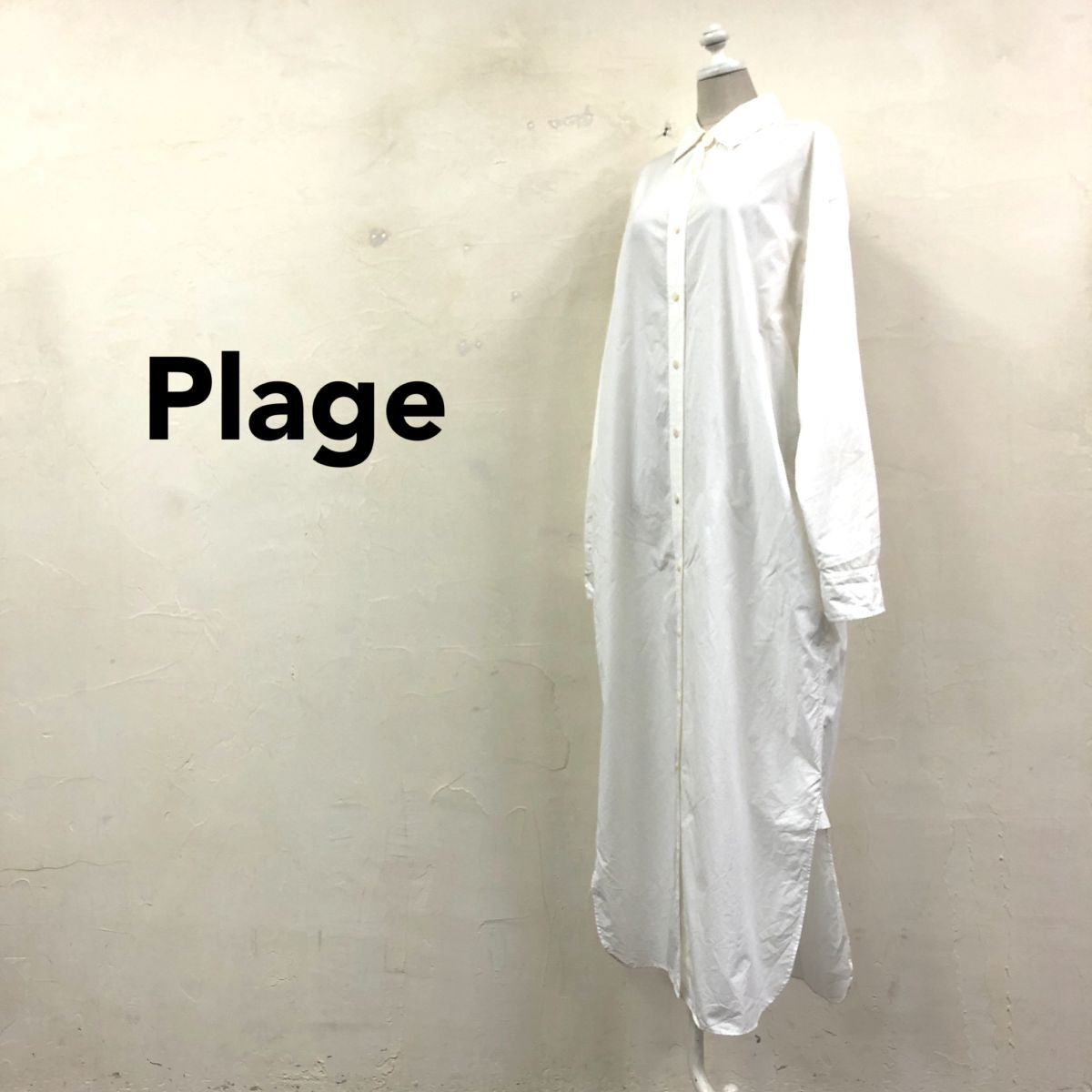 > 2K1566-G◆ plage プラージュ コットンロングシャツワンピース マキシ 長袖 Iライン サイドスリット ラウンドヘム 無地 ◆ size38 白 綿