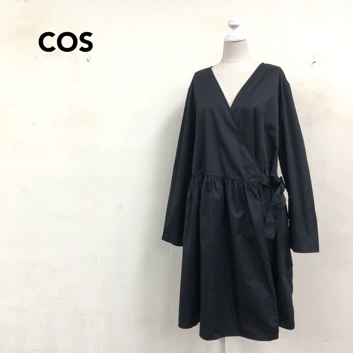 > 2K1627-K◆COS コス 長袖カシュクールワンピース◆ブラック 無地 薄手 ギャザー 綿100% カジュアル 膝丈 レディース