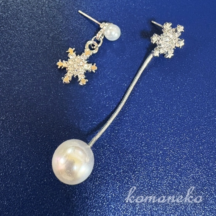 - B341 ピアス レディース 左右非対称 パール 揺れる 雪の結晶 タッセル ロングピアス スタッドピアス