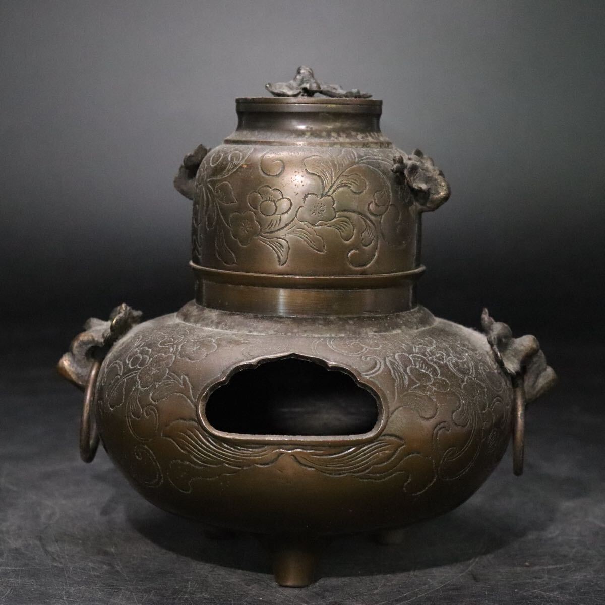 - 時代 銅製 彫金 茶釜 / 古銅 銅器 煎茶道具 釜 風炉釜 香炉 香道具 .B1081