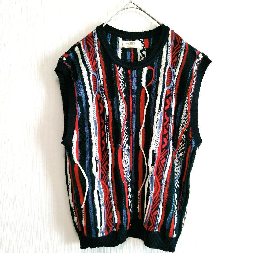 - 3Dニット ベスト クレイジーパターン 麻混 リネン L