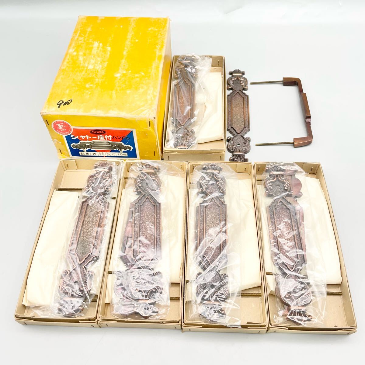 - [新品 未使用] ソーワ シャトー 座付ハンドル 大 全長190mm 足巾125mm 10個 アンティーク 建具 家具 戸棚 ドア 金物屋 在庫品 まとめ売り