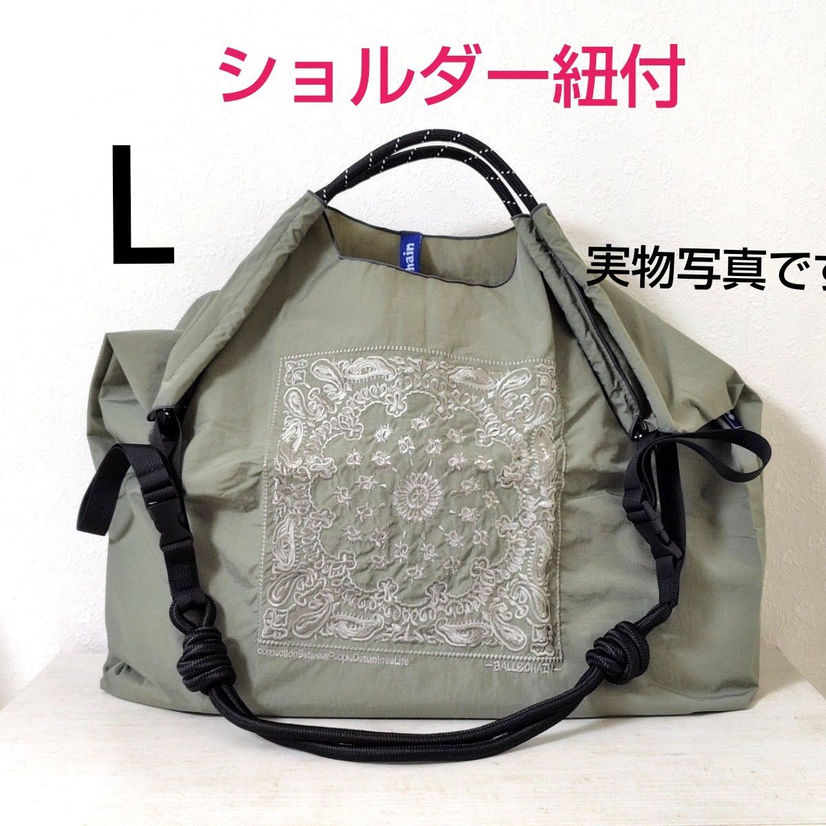 - L ペイズリー 刺繍 バンダナ エコバッグ カーキ ストラップ付き トートバッグ トートバッグ ショルダーベルト付
