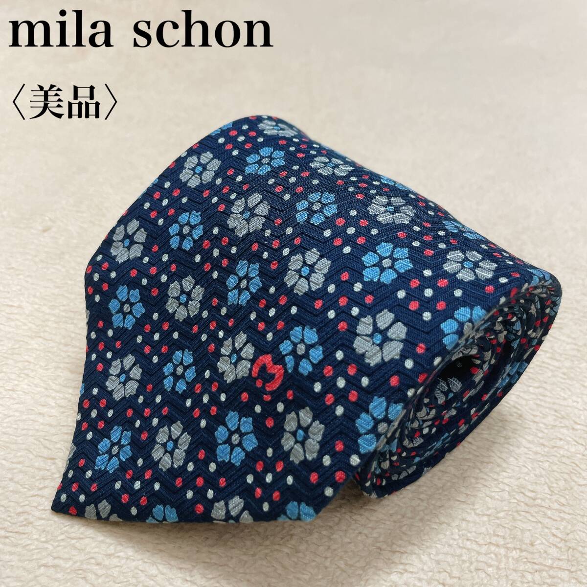 > 【美品】mila schon ミラショーン シルク ネクタイ 花柄 小紋 上品 イタリア製 ネイビー 高級感 エレガント ビジネス スーツ ドット 4-14