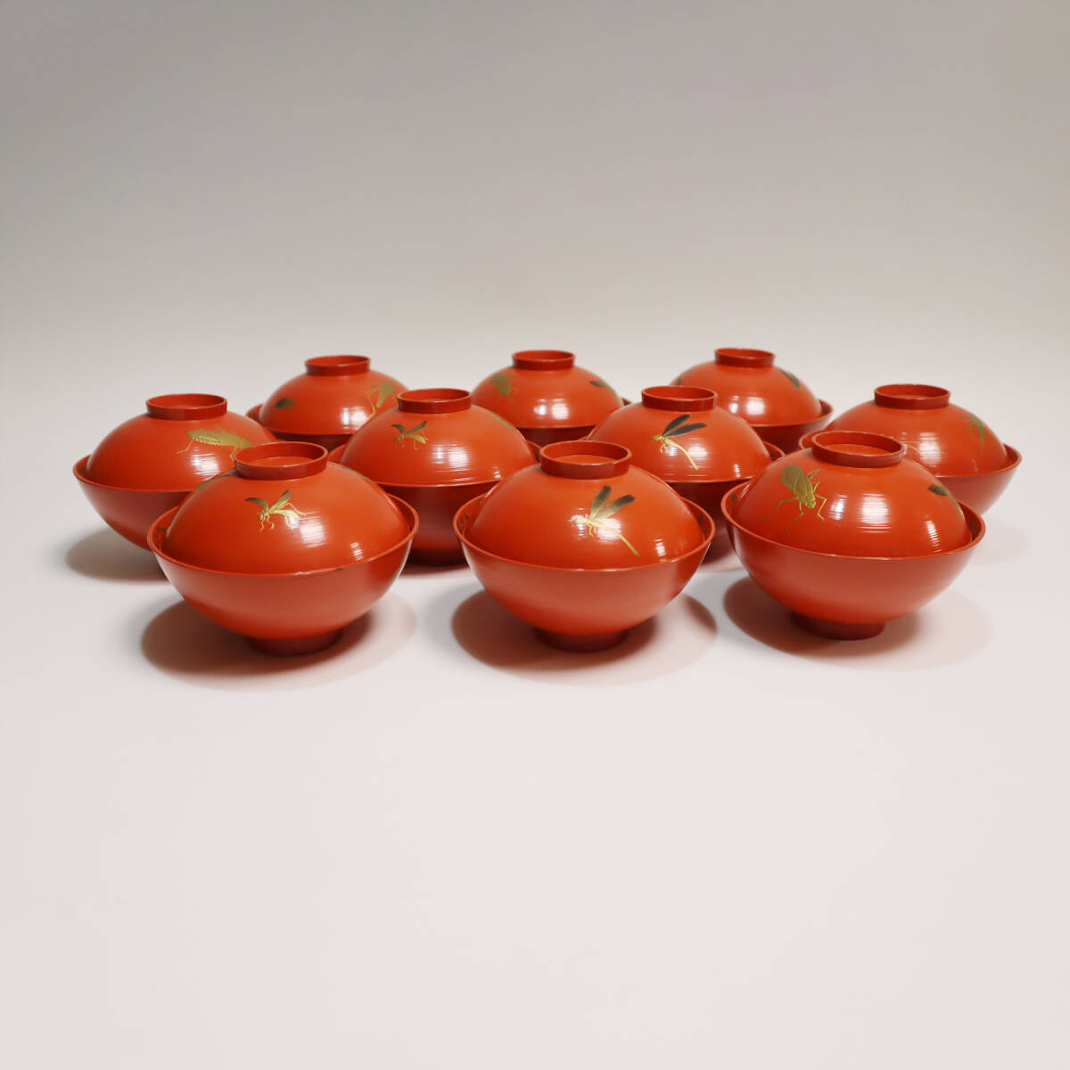 - 洗い朱萩蒔絵 吸物椀 10客 箱有 1客蓋カケ有 うつわ/食器