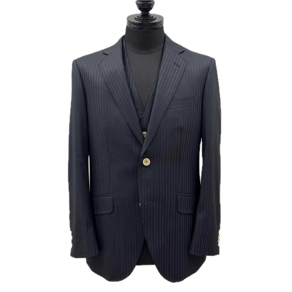 - サンプル品未着用 イタリア レダ社シルキーエフェクト生地ブラックシャドーストライプ 3ピーススーツ サイズ48相当 身長178体重75前後