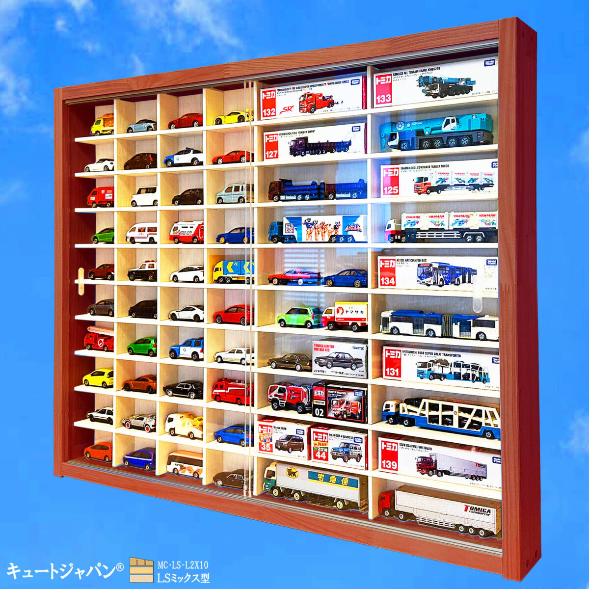 - 送料無料★【木製ミニカーケース】トミカ40台・ロングトミカ20台 アクリル障子付 マホガニ色塗装 日本製 LSミックス型