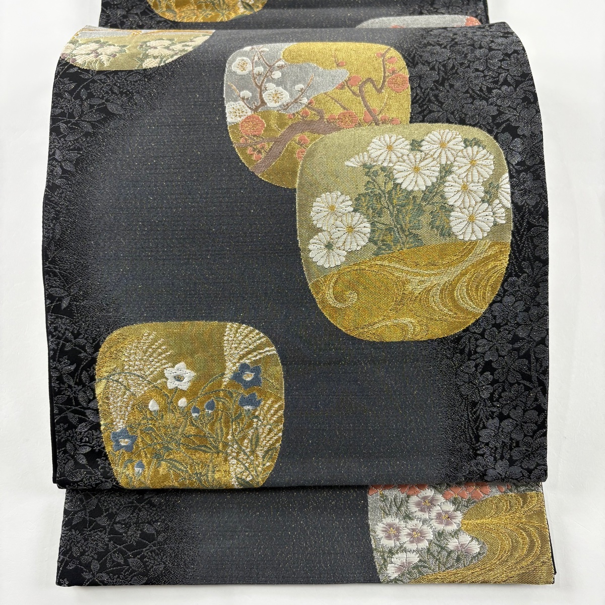 > 袋帯 美品 秀品 団扇 草花 金銀糸 箔 黒灰 六通 正絹 【中古】