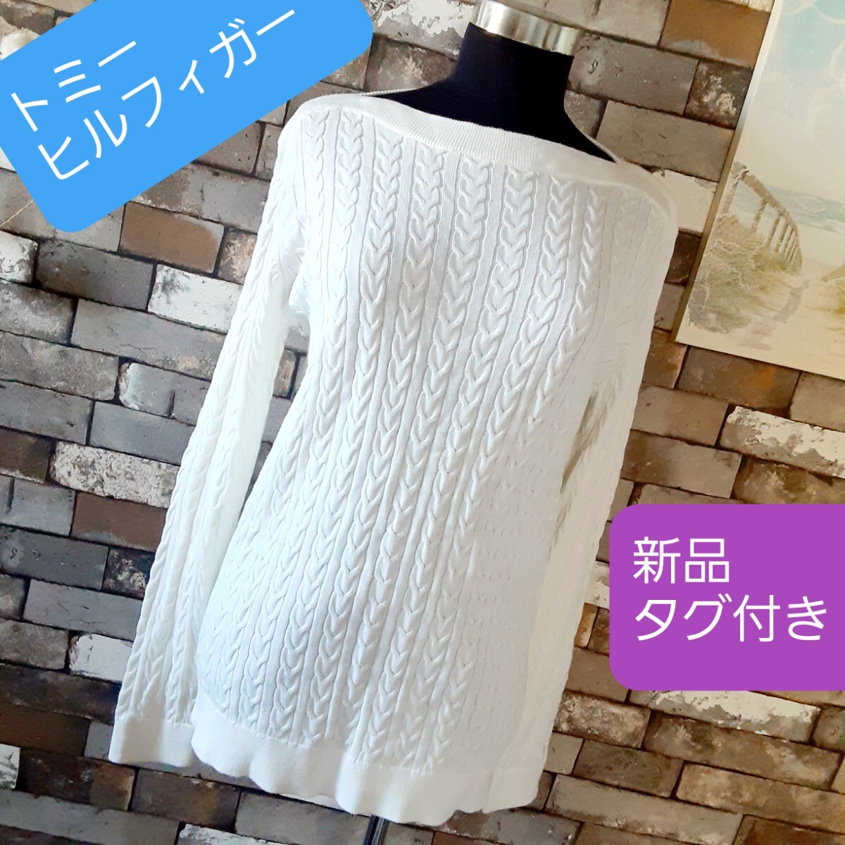 - トップス ニット 白 トミーヒルフィガー チュニック 長袖 ロゴ入り