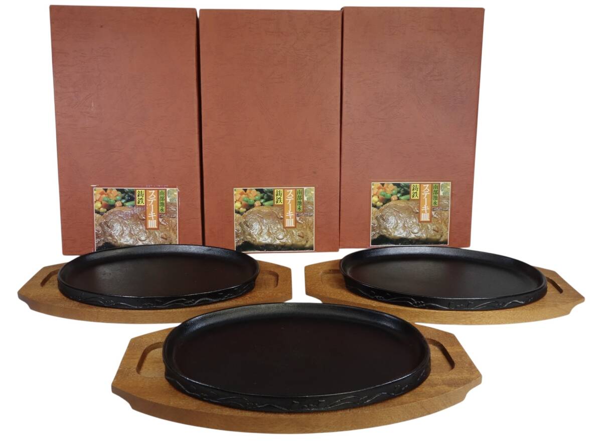 - 昭和ビンテージ 南部鉄器 南部池永 ステーキ皿 3枚セット 波千鳥 木台付 鉄板 箱付 1970〜1980年代 HKE709(追加)