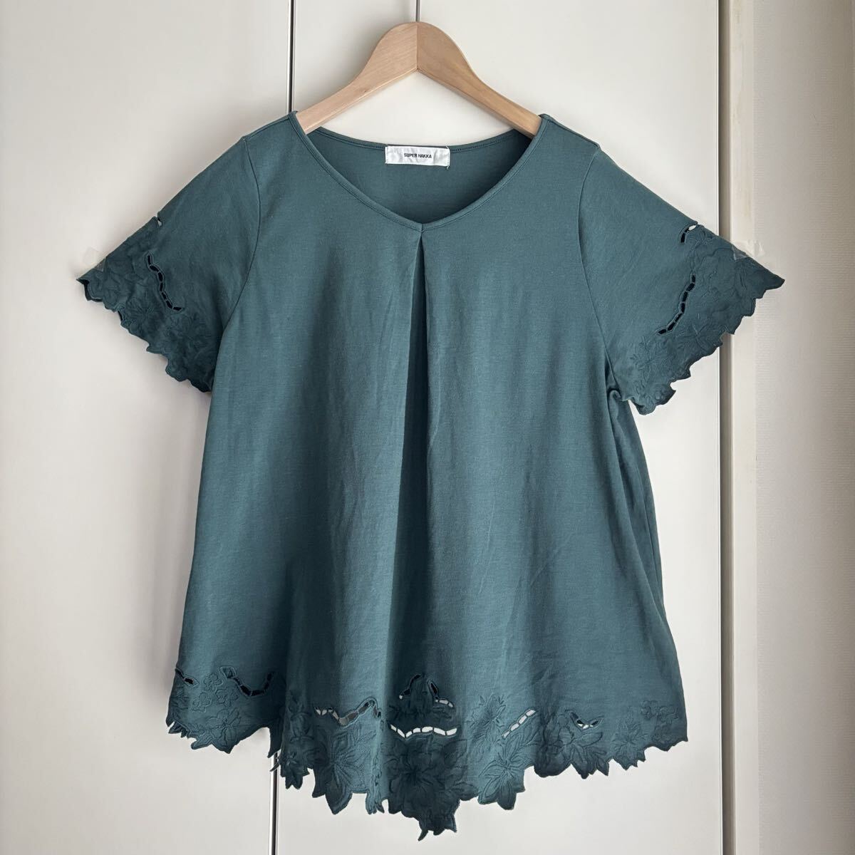 - スーパーハッカ SUPER HAKKA 半袖カットソー グリーン 裾レース スカラップ刺繍 ボタニカル 花柄 深緑