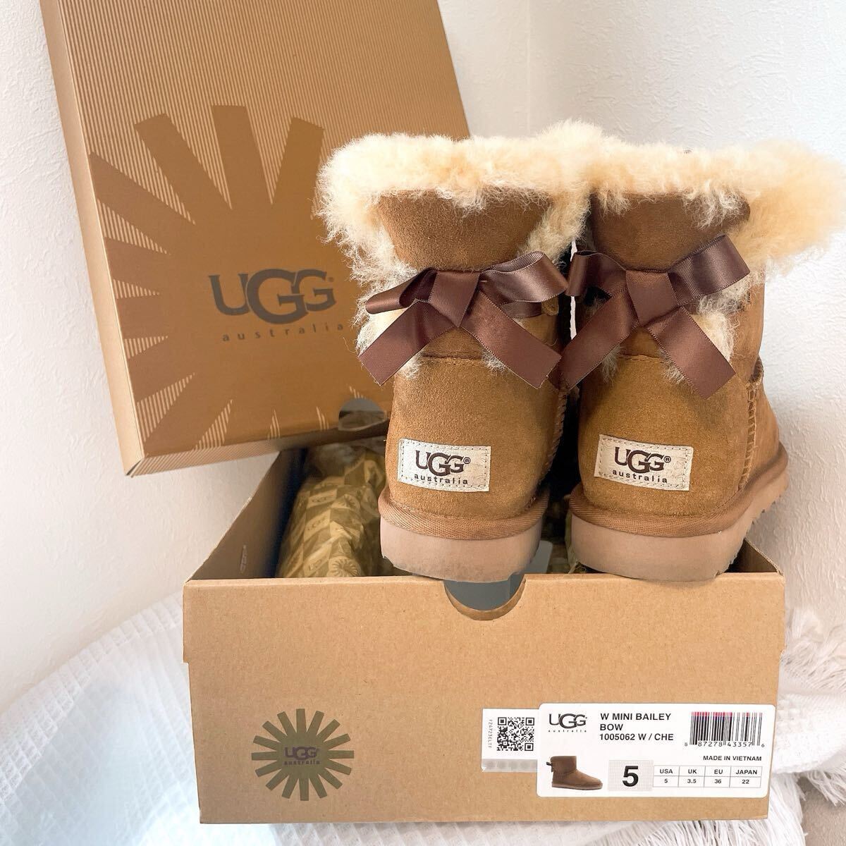 - 新品アグUGGミニ ベイリー ボウMini Bailey BowチェスナットChestnutムートン ブーツ22cmリボンUSA5シープスキンEU36ファーUK3.5 Sサイズ