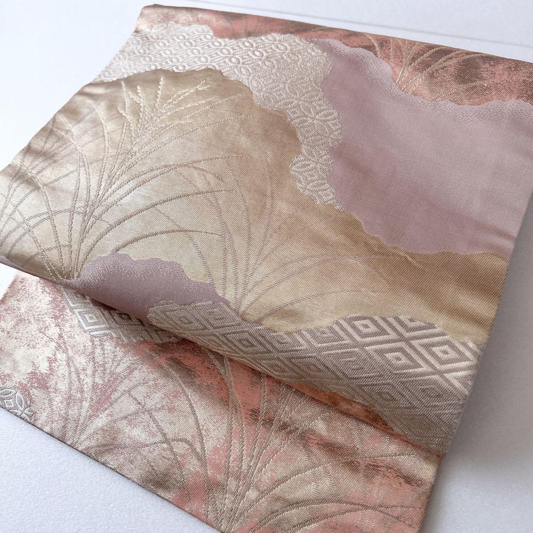 > 正絹 名古屋帯 薄紅梅色 金糸織 松葉文様 六通柄 348cm