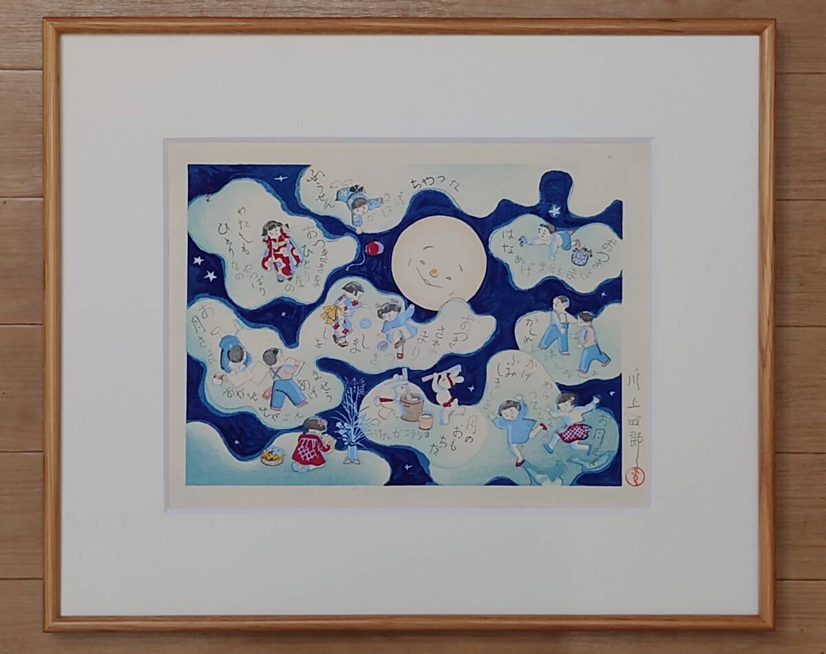 - 希少&珍品 ◆ 日本近代童画史の父 ◆ 川上四郎 作品 【お月さま】手摺り木版画 直筆サイン印譜あり ◆真作保証◆