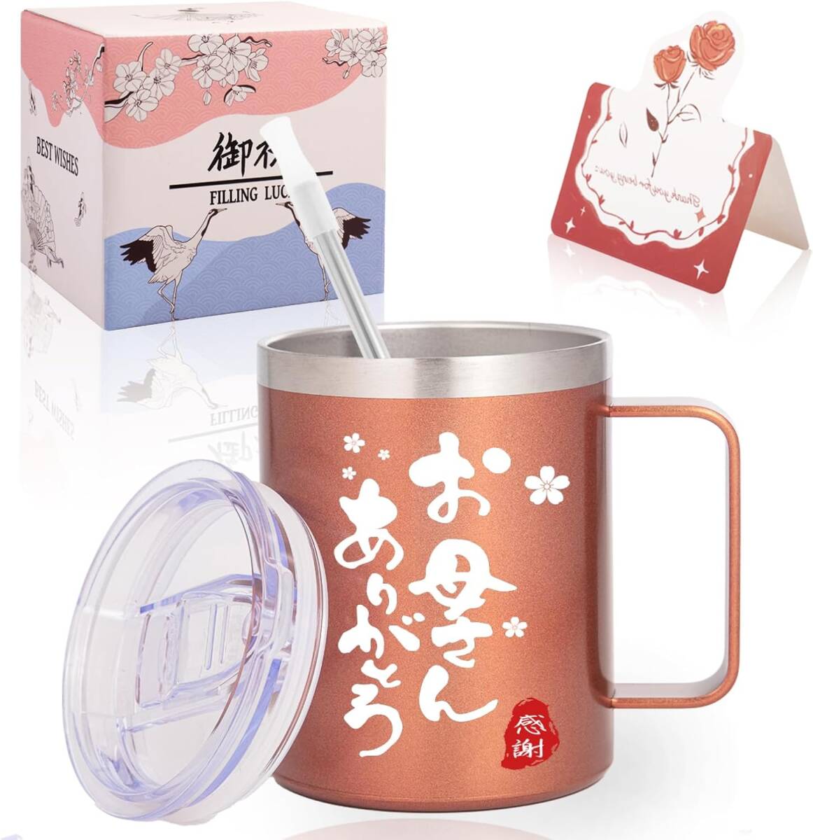 - FILLING LUCK 母親 誕生日 ステンレス 保冷保温 真空断熱 コーヒーカップ 蓋付き ストロー付き コップ ローズゴール 350ml