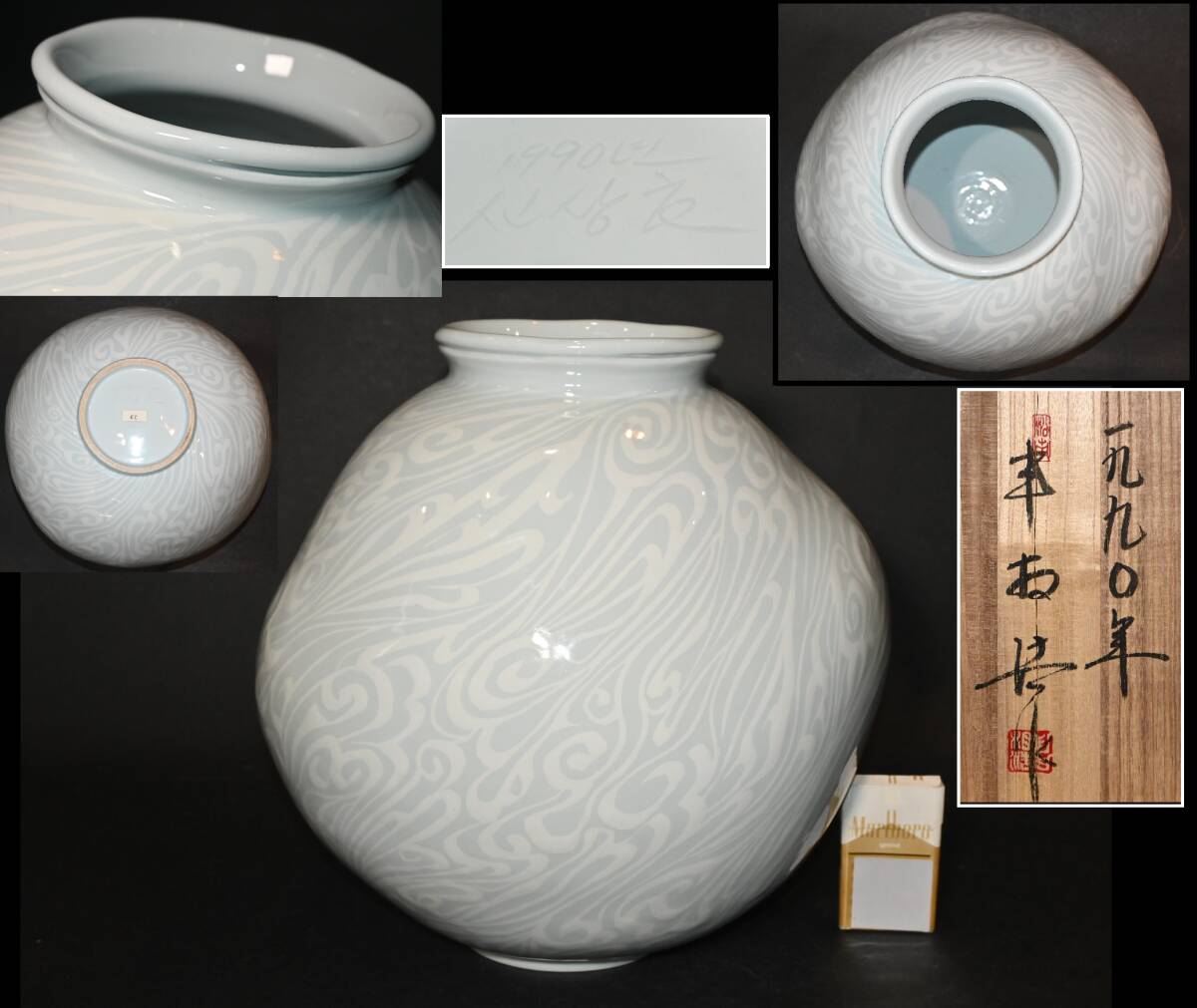 > 韓国人間文化財■釜谷陶房 松南 申相浩 作■ 1990年作 白磁 大壷 高約35cm 共箱 大花瓶 飾壷 大作 現代アート マーブル文様 練上 練込