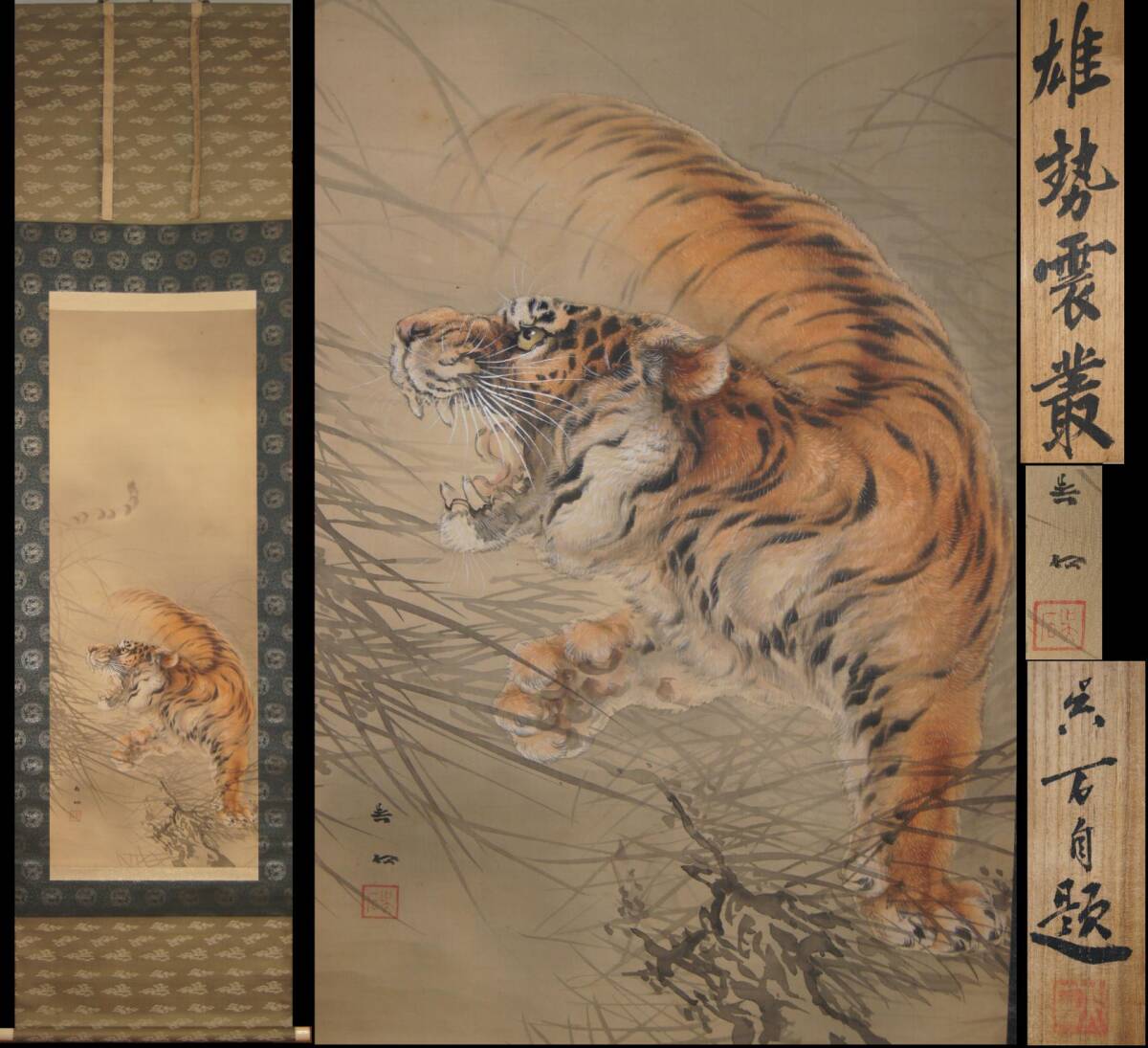 - 真贋保証■三尾呉石■ 猛虎図『雄勢震叢』日本画 掛軸 絹本 肉筆 共箱 掛け軸 虎の呉石 大橋翠石に師事 東京日本橋生 勇虎 検:中国