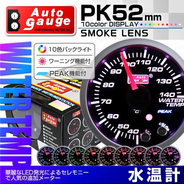 > オートゲージ 水温計 52mm ワーニング機能 ピーク機能 スイス製ステッピングモーター 10色点灯 スモークレンズ 追加メーター 計器 黒