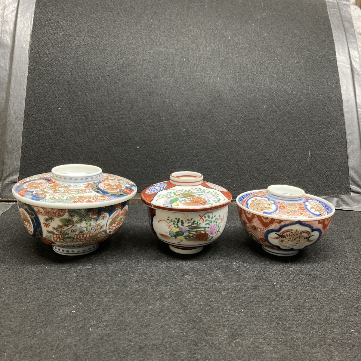 - 色絵磁器 蓋付き 茶碗、小鉢 三客組 アンテーク
