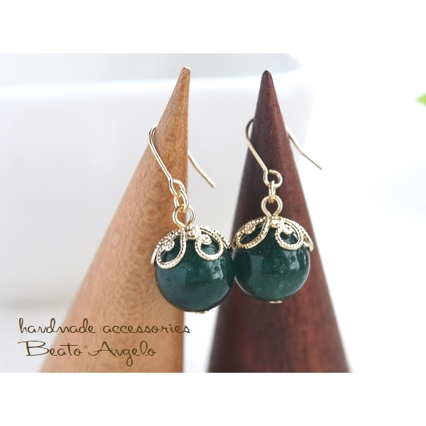 > ■+angelo+天然石アベンチュリンの一粒ピアス(p-087)G 10mm グリーン シンプル 花座 チタン 樹脂 イヤリング